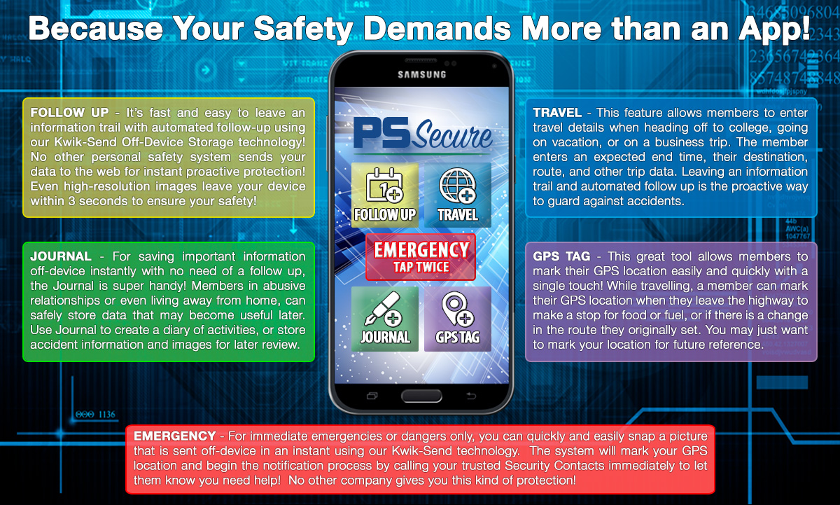Everyone can benefit from the use of our Smart Automated Notification and Deterrent System software, coupled with the PS Secure mobile application technology. These two powerful software technologies work together with our Kwik-Send compression technology to give you, your family, and your coworkers the highest level of safety available anywhere!
